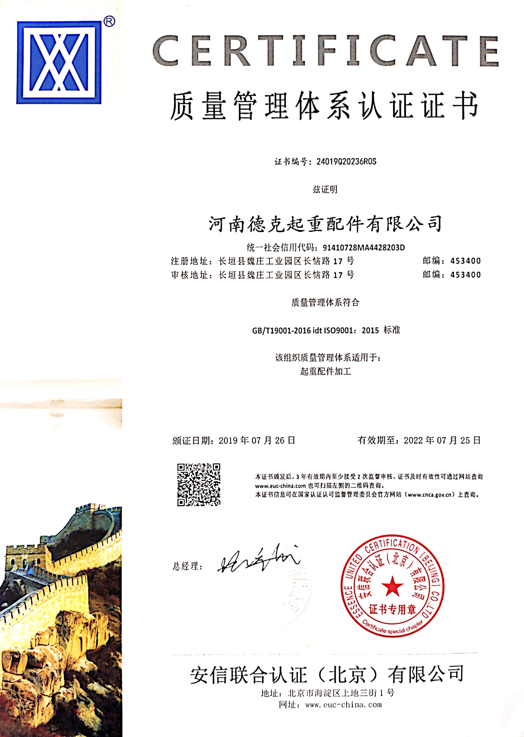河南德克起重配件有限公司質量管理體系適用于:起重配件加工