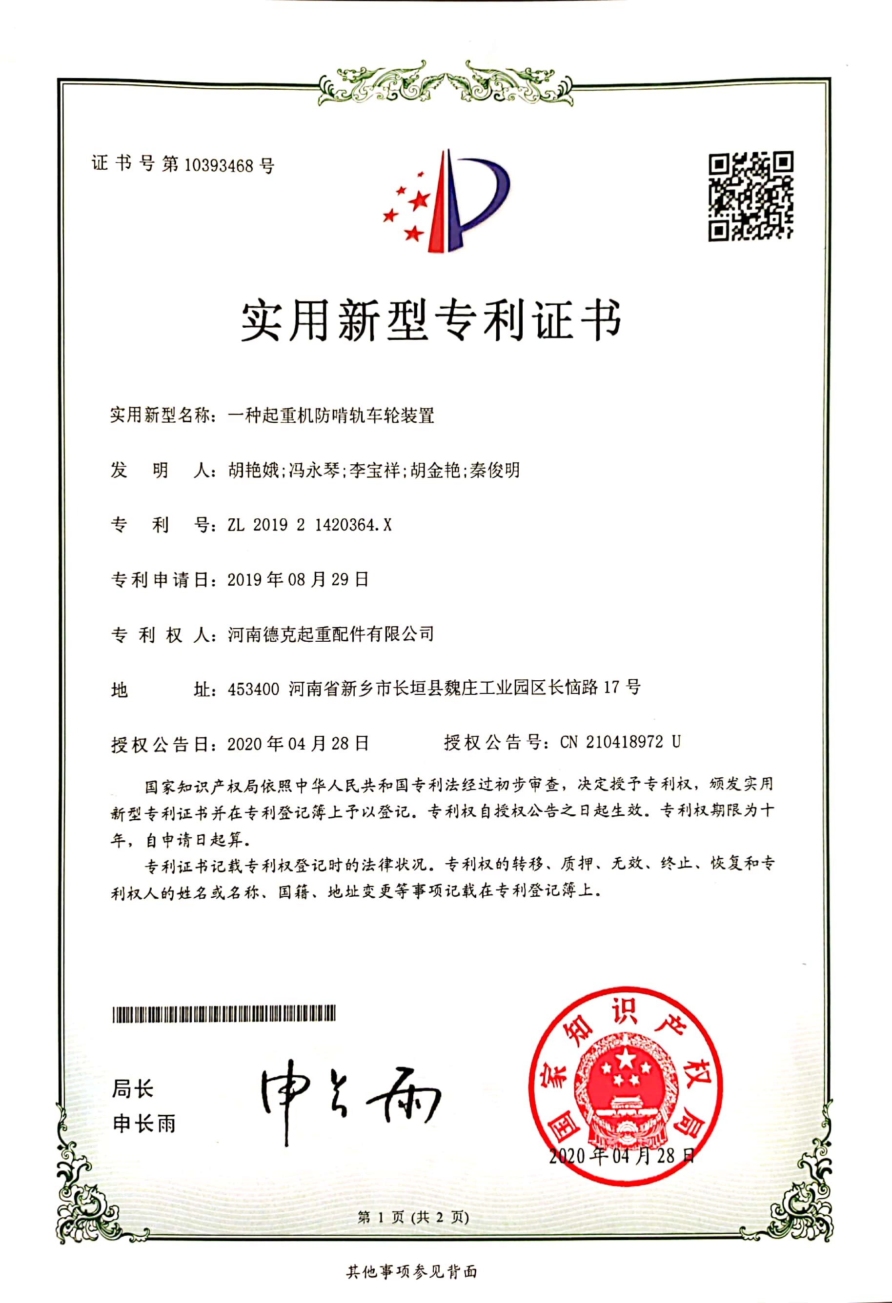 證書介紹 一種起重機(jī)放啃軌車輪裝置