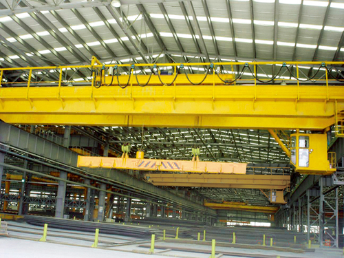 本起重機采用掛梁吊運長件鋼坯、板材、棒材、盤圓等物品,配置電磁吸盤或夾鉗或特殊群鉤進行吊裝,主要由箱形橋架、起重小車、大車運行機構、司機室和電氣控制系統組成,配有停電保磁系統。起升機構多采用單電機、雙減速器、雙卷筒布置,呈雙吊點形式。掛梁布置形式分垂直于主梁或平行于主梁兩種。其余形式與QD型起重機相同。