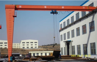它的金屬結(jié)構(gòu)像門形框架,承載主梁下安裝兩條支腳,可以直接在地面的軌道上行走,主梁兩端可以具有外伸懸臂梁。