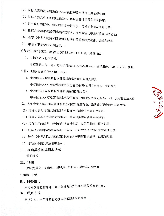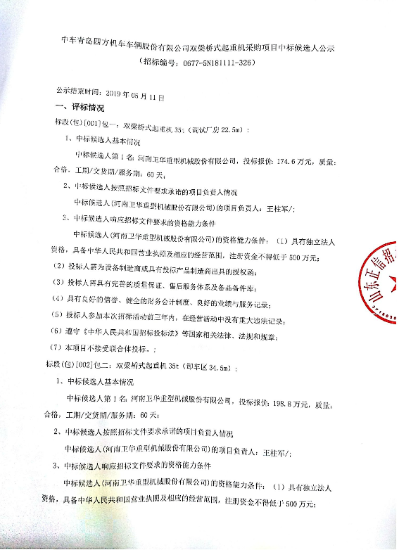 移動版:中車青島四方機車車輛股份有限公司雙梁橋式起重機采購項目中標候選人公示
