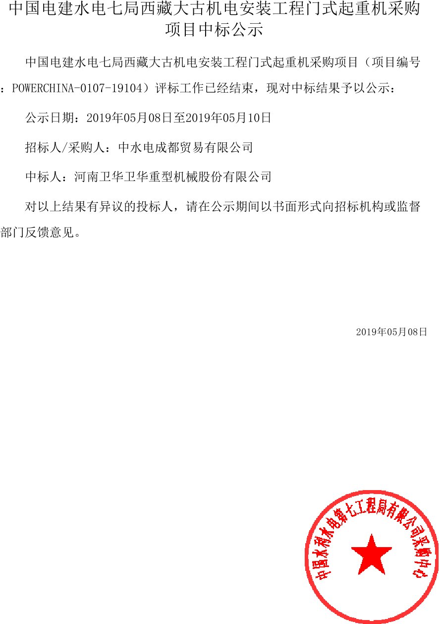 中國電建水電七局西藏大古機電安裝工程門式起重機采購項目中標公示