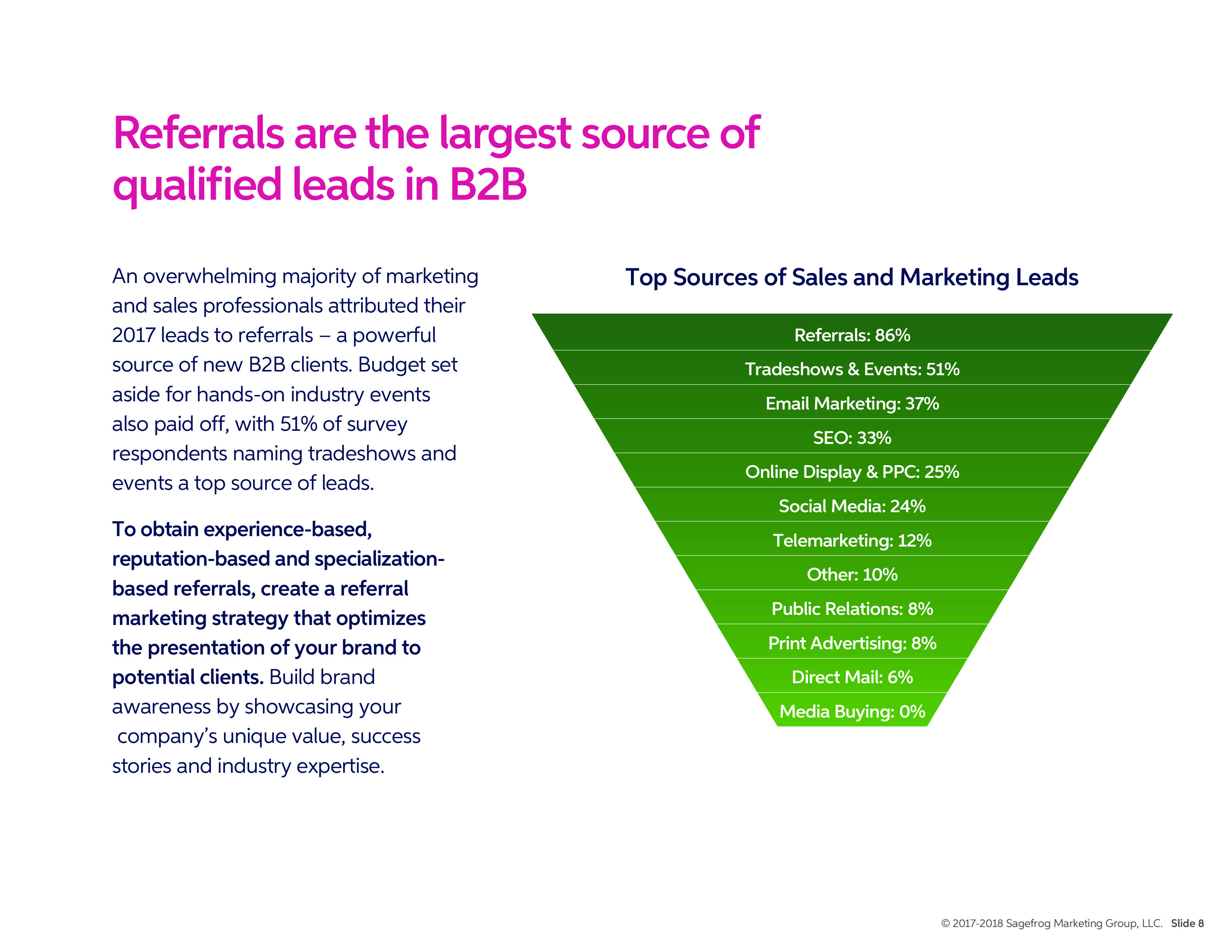 絕大多數受訪者將2017年產生的潛在客戶歸因于推薦,還有51%的受訪者認為貿易展和活動也推動了潛在客戶的產生。