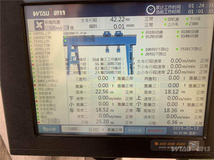 由微特技術(shù)有限公司為南通誠(chéng)投安裝的250T龍門(mén)吊WTSM-A型安全監(jiān)控系統(tǒng)順利通過(guò)南通特檢院的驗(yàn)收,現(xiàn)已經(jīng)投入使用。