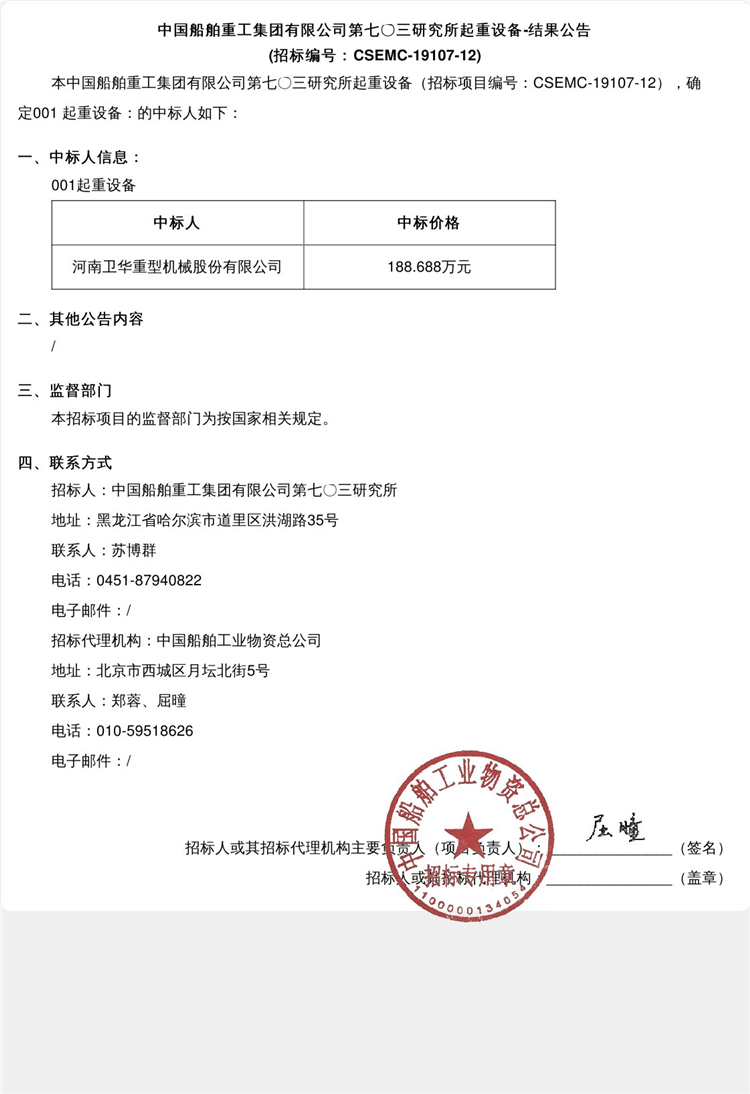 中國船舶重工集團有限公司第七〇三研究所起重設(shè)備-結(jié)果公告