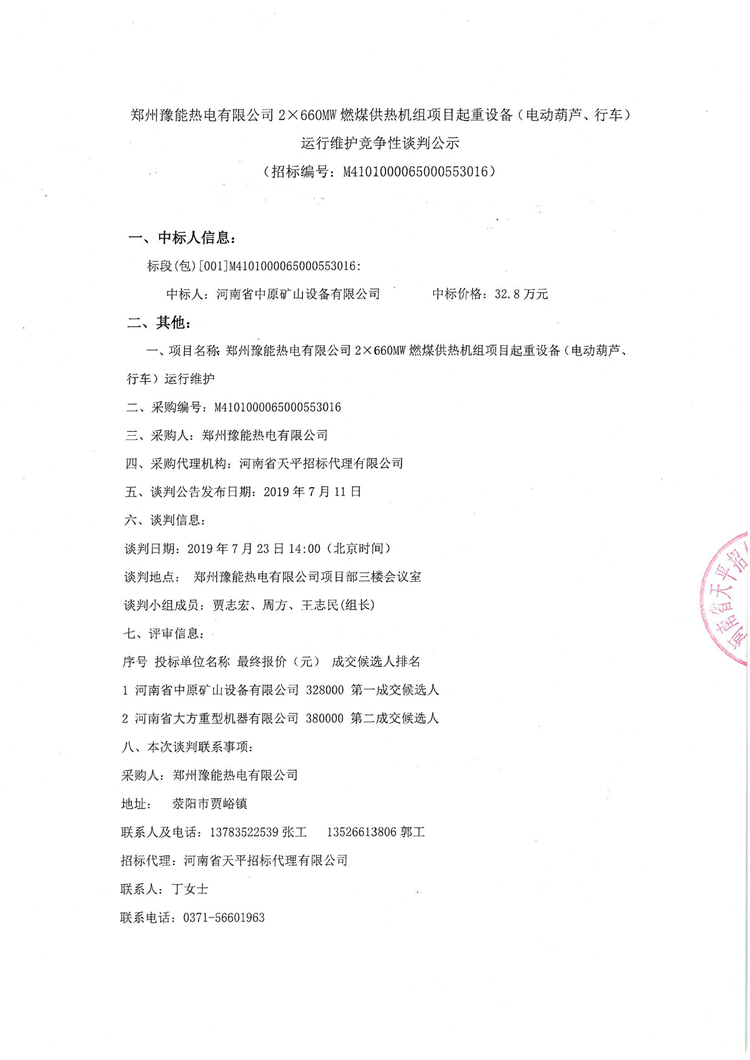 移動版:鄭州豫能熱電有限公司2×660MW燃煤供熱機組項目起重設備(電動葫蘆、行車)運行維護競爭性談判公示