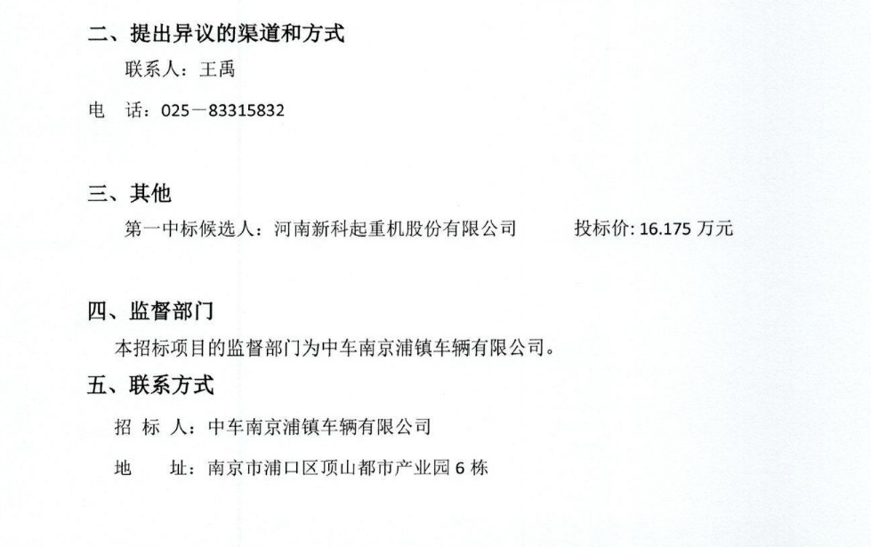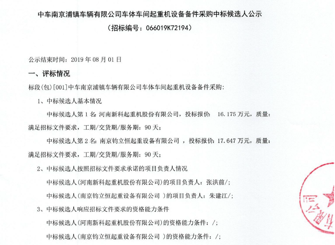 中車南京浦鎮(zhèn)車輛有限公司車體車間起重機設(shè)備備件采購中標候選人公示