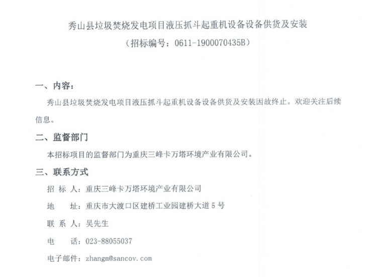 移動版:秀山縣垃圾焚燒發(fā)電項目液壓抓斗起重機設備設備供貨及安裝終止公告
