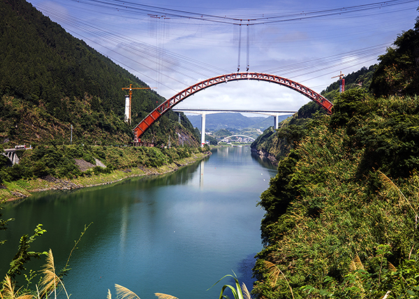 依山而筑,地形復(fù)雜,兩側(cè)拱腳高差43.5米。鐵四院設(shè)計負責人張杰介紹,為了完成這個世界之最的“不平衡美”,設(shè)計與施工方緊密配合,國內(nèi)首次采用兩片拱肋同時整節(jié)段吊裝。據(jù)悉,實施吊裝的纜索吊機,適用于深山峽谷中大型機械設(shè)備無法進場的施工。設(shè)計吊重300噸,是張吉懷鐵路目前最大噸位的起重設(shè)備。