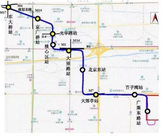 線路起點為東大橋站,沿途設京廣橋站、光華路站、核心區站、大望路站、北京東站、大郊亭站、廣渠路站,終點至廣渠東路站。