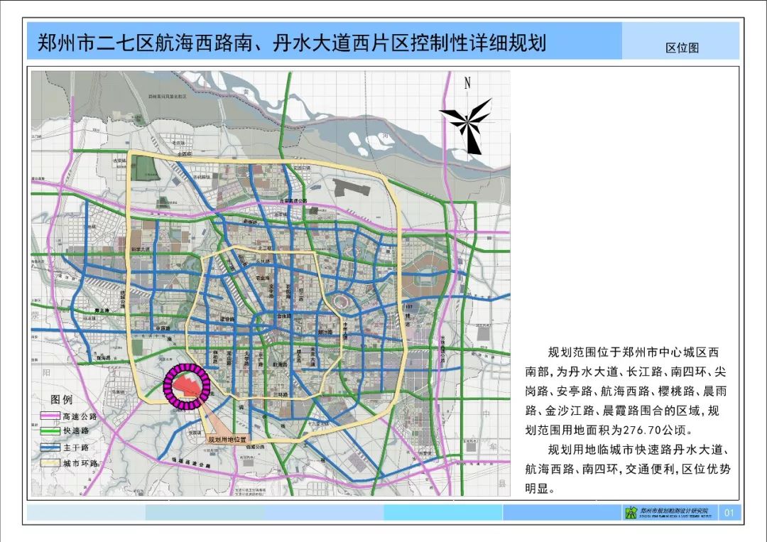 規劃范圍位于鄭州市中心城區西南部,位于航海西路南、丹水大道西,為丹水大道、長江路、南四環、尖崗路、安亭路、航海西路、櫻桃路、晨雨路、金沙江路、晨霞路圍合的區域,規劃范圍用地面積為276.70公頃(4150.5畝)。 用地性質為:(R2)二類居住用地,(A2)文化設施用地,(A33)中小學用地,(A4)體育用地,(A6)社會福利設施用地,(B1)商業用地,(S1)城市道路用地,(S41)公共交通場站用地,(S42)社會停車場用地,(U12)供電用地,(U31)消防用地,(G1)公園綠地,(G2)防護綠地