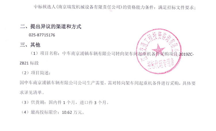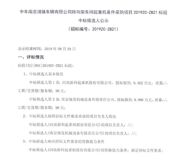 移動版:中車南京浦鎮(zhèn)車輛有限公司轉(zhuǎn)向架車間起重機備件采購項目2019ZC-ZB21標(biāo)段中標(biāo)候選人公示