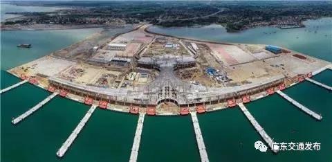 當天上午,記者來到項目現場,在陸地上,塔吊高聳,機器轟鳴,作業區道路車輛來往穿梭,一派熱火朝天的施工場景;在海灣之上,8條突堤碼頭列隊入海,1條防波堤如巨龍盤旋擁灣,氣勢恢宏。