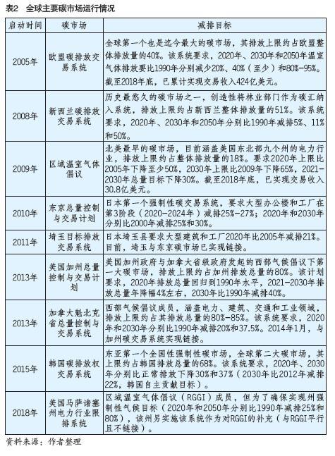 當(dāng)前,全球正面臨持續(xù)嚴峻的氣候問題挑戰(zhàn),各國2030年自主貢獻目標與實現(xiàn)巴黎氣候協(xié)定目標仍存在巨大缺口。為碳排放權(quán)定價、構(gòu)建碳交易市場,已成為國際社會促進低碳發(fā)展和技術(shù)創(chuàng)新的關(guān)鍵政策工具。除目前已運行的碳市場外,還有許多國家或地區(qū)正在籌建或考慮建立碳交易系統(tǒng)(包含中國、俄羅斯、日本、墨西哥、巴西等國家系統(tǒng)以及美國各州等區(qū)域系統(tǒng))。隨著越來越多的國家或地區(qū)考慮將碳市場作為節(jié)能減排的政策工具, 碳交易已逐漸成為全球應(yīng)對氣候變化政策的核心支柱(全球目前主要碳市場運行情況見表2)。