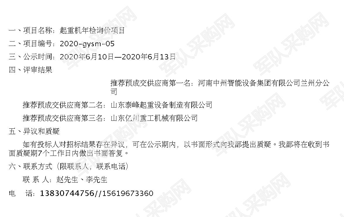 起重機年檢詢價中標公示(2020-gysm-05)