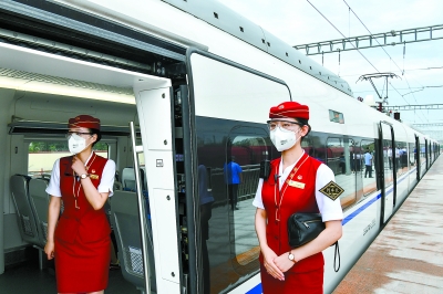 昨日早晨,在良鄉(xiāng)站站臺(tái),乘務(wù)員在車門口迎接乘客。