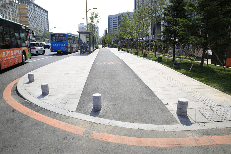 整個提升改造全程設置了自行車道、人行步道,讓慢行系統更加疏朗、通透。全線設置盲道,在公交站點處新增盲道,確保盲人出行安全。按照規劃紅線,取締一批占用慢行系統的停車位,最大限度保證慢行系統的連續性。并且將自行車道抬高與人行步道平齊,雨天路面可以直接向兩側樹池和綠化帶自然排水,更具海綿城市建設理念。