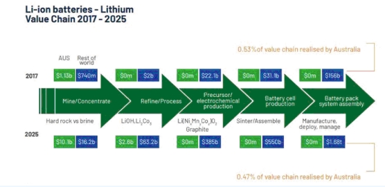 根據(jù)評估結(jié)果,盡管澳大利亞已經(jīng)占據(jù)了電池生產(chǎn)原料供應(yīng)市場的很大一部分,但澳大利亞卻錯失了包括材料提煉在內(nèi)的下游加工以及電池生產(chǎn)和組裝等更大的市場機會。