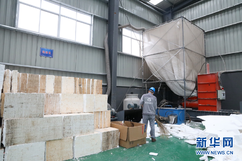 上海市閔行區浦錦街道兩網融合中轉站采用泡沫冷壓方式對泡沫塑料進行壓縮處理。新華網史依靈 攝