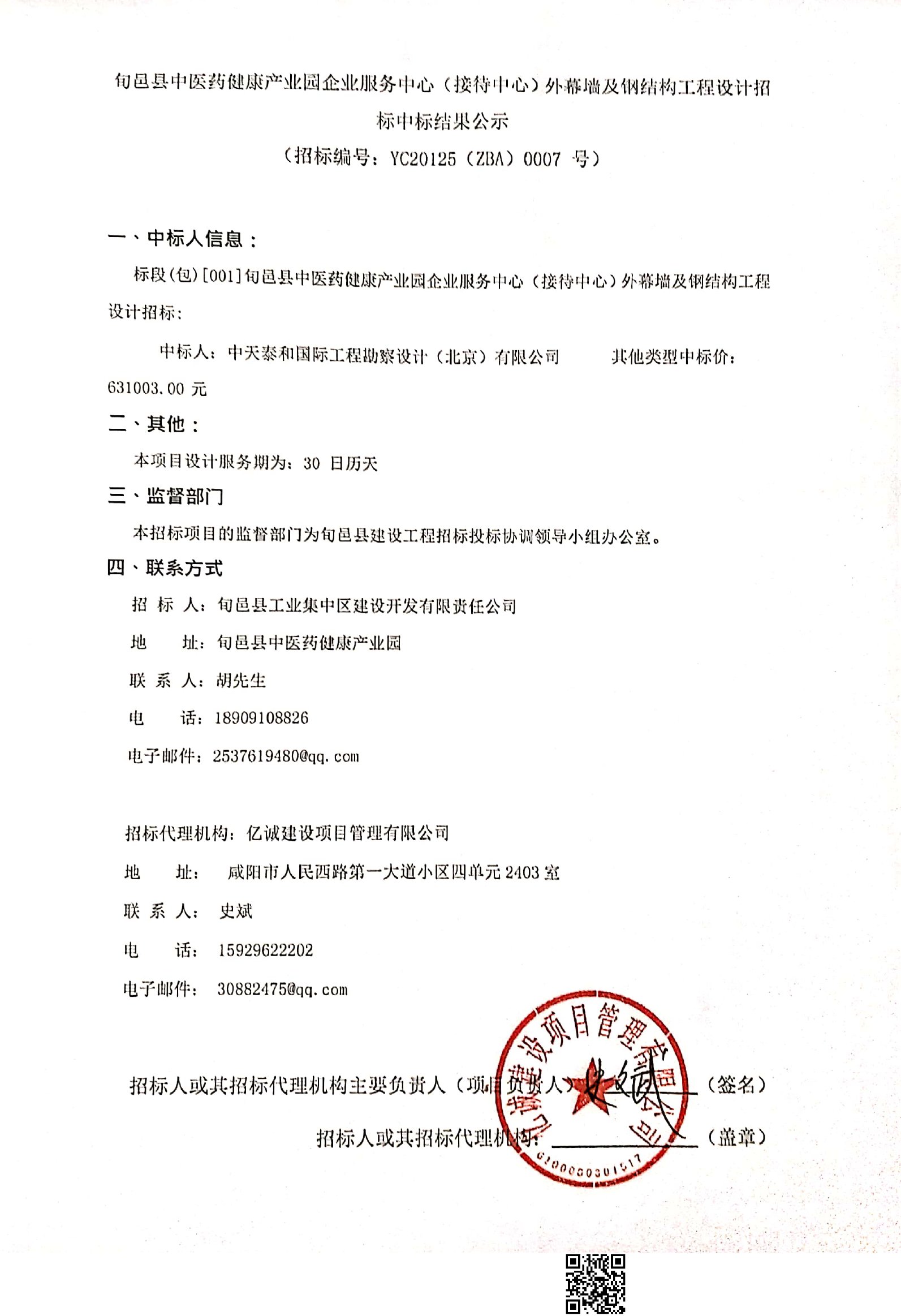 旬邑縣中醫(yī)藥健康產(chǎn)業(yè)園企業(yè)服務(wù)中心(接待中心)外幕墻及鋼結(jié)構(gòu)工程設(shè)計(jì)招標(biāo)中標(biāo)結(jié)果公示
