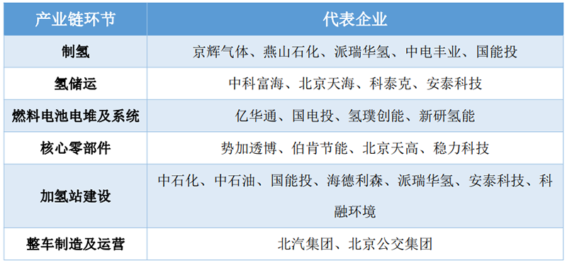 在產業基礎方面。北京已經形成了制氫、儲運、燃料電池電堆/系統、核心零部件、加氫站建設、整車制造的全產業鏈。