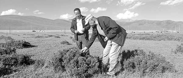 峨堡鎮黨委書記如意和茶廠廠長火博程實地查看野生金露梅生長情況。 通訊員 王軍 攝