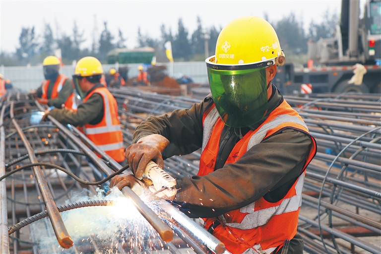 1月10日下午,在海口江東新區高品質飲用水水廠項目工地,工人在一起焊接鋼筋籠。 通訊員 郝尉淞 攝
