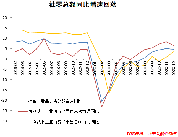 2020年12月社零總額同比增長4.6%,較上月增速有所放緩,但仍為全年第二高。不過,2020年12月開始的疫情反復對國內消費產生了壓制。限額以上的消費增速下滑明顯,2020年12月中汽協汽車銷量同比增長6.4%,增速較上月下滑了6.2個百分點,而進入2021年1月后汽車銷售依然呈現同比下滑態勢。限額以下增速有所恢復,但隨著2021年1月疫情再次進入嚴峻時期,線下服務業和消費很可能將再次受到明顯沖擊。