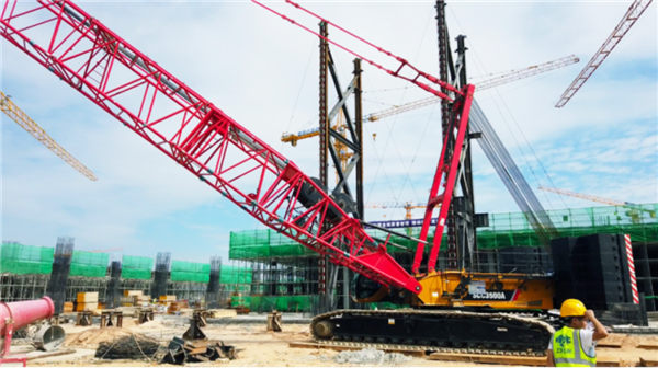 施工現(xiàn)場(chǎng),徐工XGC500履帶起重機(jī)采用“96+7”米標(biāo)準(zhǔn)風(fēng)電工況,將直徑130.5米的葉片有條不紊地吊至90米高空,隨后精準(zhǔn)對(duì)接就位。