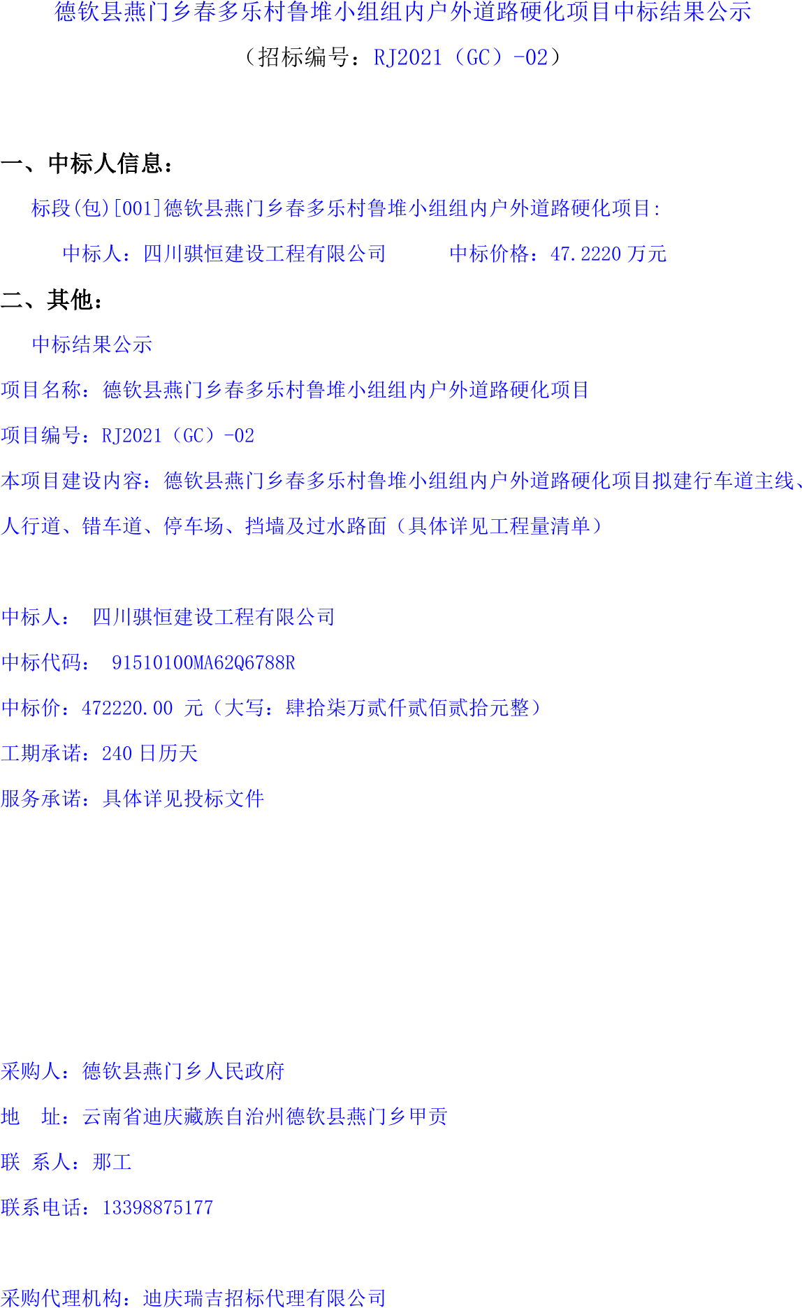 移動(dòng)版:云南:德欽縣燕門鄉(xiāng)春多樂村魯堆小組組內(nèi)戶外道路硬化項(xiàng)目中標(biāo)結(jié)果公示