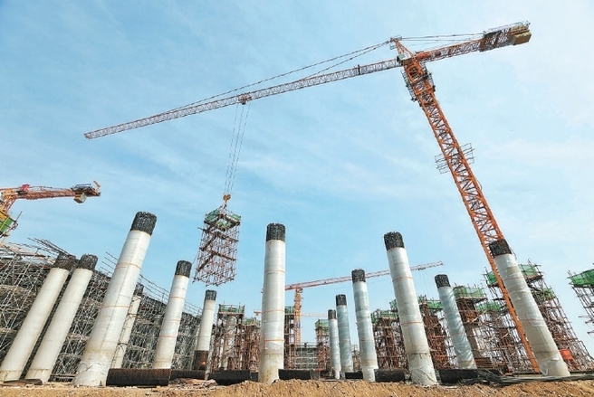 昨天,在地鐵19號(hào)線新宮車輛段,咽喉區(qū)框架柱操作架吊裝施工正在進(jìn)行。 記者 潘之望攝
