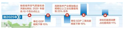 實施意見明確了主要目標:到2025年,產業結構、能源結構、運輸結構明顯優化,綠色產業比重顯著提升,基礎設施綠色化水平不斷提高,生產生活方式綠色轉型成效顯著,能源資源配置更加合理、利用效率大幅提高;生態環境持續改善,主要污染物排放總量持續減少;市場導向的綠色技術創新體系更加完善,法規政策體系更加有效,綠色低碳循環發展的生產體系、流通體系、消費體系初步形成;地級城市空氣質量優良天數比例比2020年提高10個百分點以上,單位GDP能耗下降15%,單位GDP二氧化碳排放下降19%,高新技術產業增加值占規模以上工業比重提高到25%左右,非化石能源消費占比提高到11%。