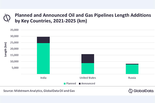 領先的數據和分析公司GlobalData表示,預計印度將在2021年至2025年之間領導全球計劃和宣布的油氣管道長度擴建項目,到2025年將占全球管線增加量的23%左右。
