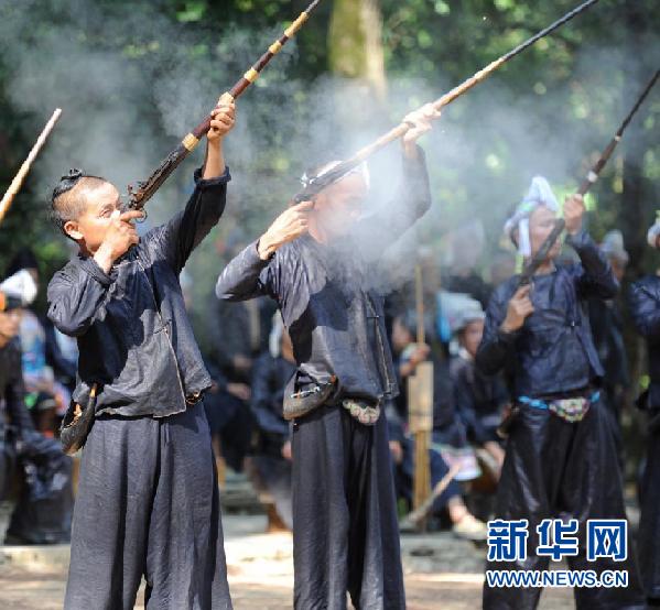 在位于貴州省黔東南苗族侗族自治州從江縣的岜沙苗寨,苗族男子鳴槍迎接進入部落的客人(2014年7月23日攝)。新華社記者陶亮攝