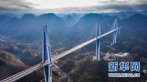 站在觀景平臺上,全長2135米的平塘特大橋盡收眼底。橋塔像三顆巨釘鑲嵌在崇山峻嶺之間,藍白配色與天空交相輝映,時常云霧繚繞,宛若“天空之橋”飛架于山谷,因此得名。“天空之橋”不僅壯美而且高大,它中間橋塔高達332米,是世界橋梁中最高的混凝土塔。