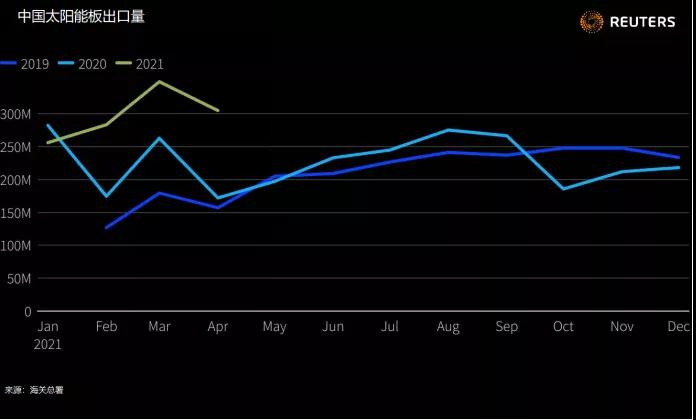 圖片:2021年一季度光伏組件出口曲線圖,來源:路透社。