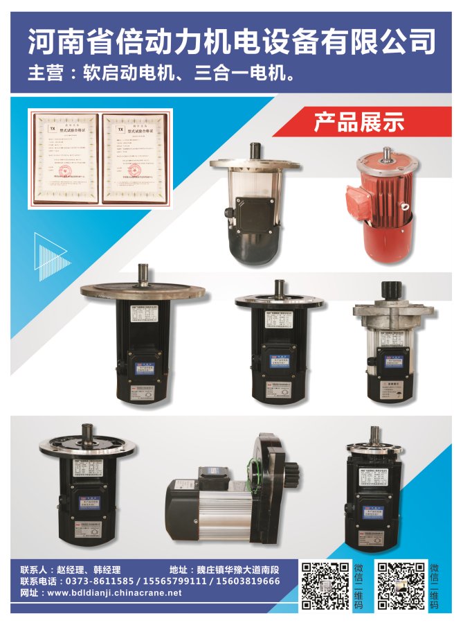銷售熱線:/河南省倍動力機電設備有限公司,專業生產大車運行葫蘆運行軟啟動電機,三合一電機。配套橋門式起重機,各種型號鋼絲繩電動葫蘆。我們將以放心質量,貼心的服務,贏得廣大新老客戶的信賴。 選擇倍動力電機,讓你選擇放心! 歡迎各位廣大客戶蒞臨公司參觀,選購!