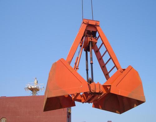 抓斗,是指起重機(jī)抓取干散貨物的專用工具。由兩塊或多塊可啟閉的斗狀顎板合在一起組成容物空間,裝料時(shí)使顎板在物料堆中閉合,物料被抓入容物空間,卸料時(shí)顎板在料堆上懸空狀態(tài)下開啟,物料散落在料堆上,顎板的開合一般由起重機(jī)起升機(jī)構(gòu)鋼絲繩操縱。抓斗作業(yè)無繁重體力勞動(dòng),可達(dá)到較高的裝卸效率并確保安全,是港口主要干散貨裝卸工具。按作業(yè)貨物的種類,可分為礦石抓斗、煤炭抓斗、糧食抓斗、木材抓斗等。