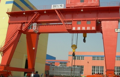 它的金屬結(jié)構(gòu)像門(mén)形框架,承載主梁下安裝兩條支腳,可以直接在地面的軌道上行走,主梁兩端可以具有外伸懸臂梁。